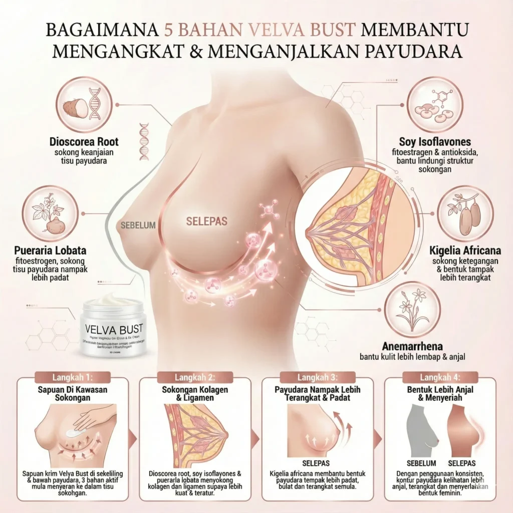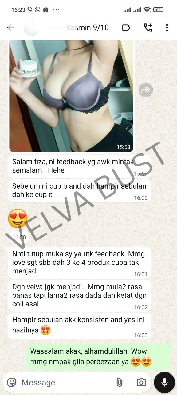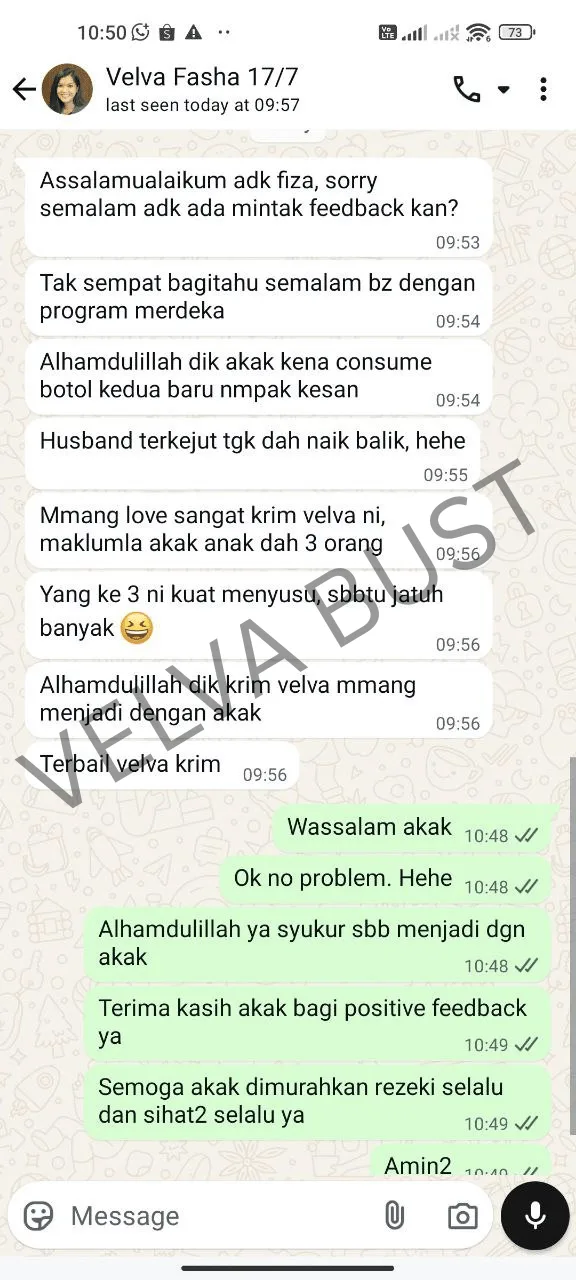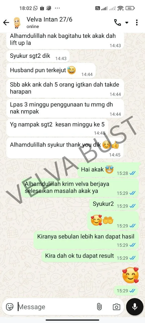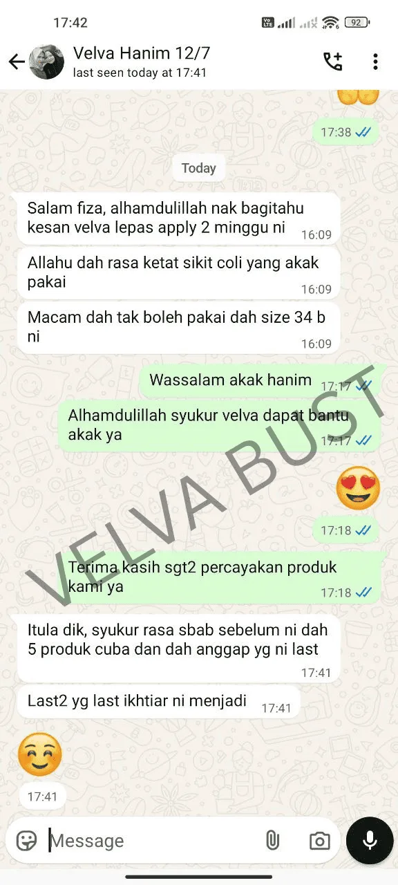 Ramai pelanggan kami berkongsi testimoni positif selepas guna Velva Bust secara konsisten. Namun, keberkesanan bergantung kepada tubuh individu dan cara penggunaan. Kami tidak janji kesan segera, tapi dengan penggunaan berterusan hasil lebih mudah dirasai.