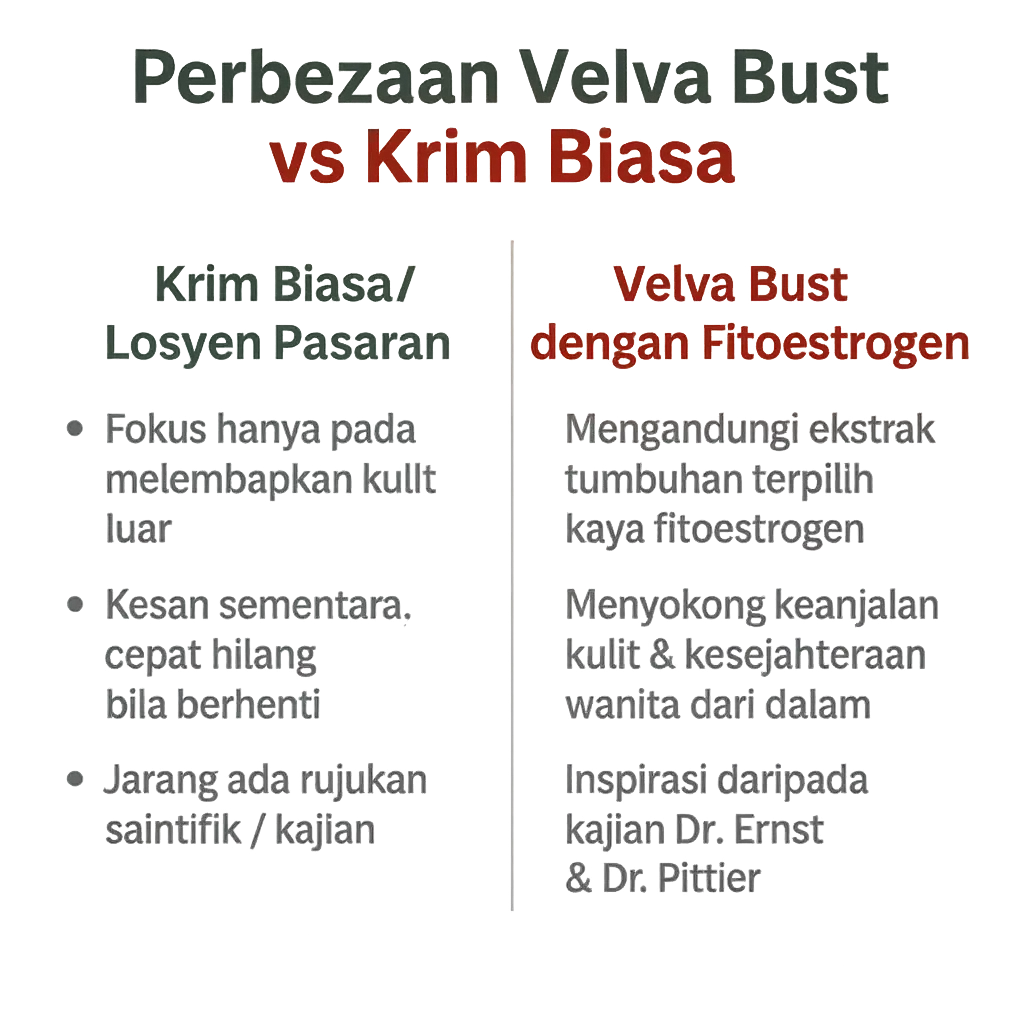 Formulasi Velva Bust diinspirasikan daripada hasil kajian ini, dengan tujuan menyokong wanita untuk tampil lebih yakin tanpa gangguan selulit pada bahagian sensitif.Ernst E. (2003), Pittier E. (2011), Kurzer M.S. (2002), Chen M-N et al. (2015), Hussain H. et al. (2018)