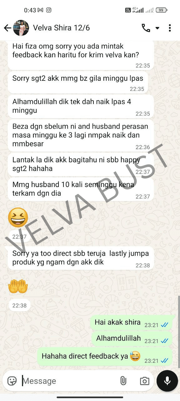 Ramai pelanggan kami berkongsi testimoni positif selepas guna Velva Bust secara konsisten. Namun, keberkesanan bergantung kepada tubuh individu dan cara penggunaan. Kami tidak janji kesan segera, tapi dengan penggunaan berterusan hasil lebih mudah dirasai.